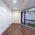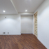 寝室として使用するお部屋は三角形の形状。その洋室の形に合わせて床のフロアタイルを斜めに張ることでまとまりある空間となりました。フロアタイルはあたたかみを感じるオークのフローリング調。壁は塗装の質感が残るようにあえてラフに塗り、仕上げています。