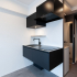 水回りの位置は何通りも検討し、一番導線が良く、生活感が隠せる形で最終決定となりました。お施主様こだわりのミラタップ製品キッチンや、いかに収納を増やせるか、という工夫でとても効率的でデザイン性の高いワンルームのお部屋が完成しました。ホワイト・ブラック・グレーでまとめられたお部屋はお施主様のメインのお住まい先とは180°雰囲気を変え、セカンドハウスならではのカラーリングが、事務所としての落ち着いた空間になっています。築年数や既存の水回りが3点ユニットだったことから、ダクト菅や給排水管のプランニングが難しくありましたが、それぞれが独立し、コンパクトながらも賃貸住居感がない、素敵なリフォームとなりました。