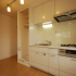 収納力のあるスライドタイプのキッチン。(LIXIL:シエラ)左側の洗濯機置き場は、ロールスクリーンで目隠しができます。上部の空間も最大限活用できるよう可動棚を設置しました。