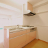 南向きのバルコニーの向こうは緑豊かな公園が広がっています。光や風も通りぬけ、緑も楽しめる気持ちの良いお部屋でしたので、キッチンからもそれらが堪能できるよう、今まで壁付だったキッチンを対面式にしリビング側へ向けました。開放感を出すため吊り戸は設けず、その分キッチン背面の可動棚で収納力を確保しました。あたたかいピンクのキッチンが明るいキッチンを更に明るくしています。
