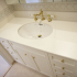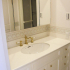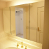 洗面化粧台は洗面室の大きさに合わせて造作しました。三面鏡も併せて造作し、背面に間接照明を入れました。T様お好みの壁紙と相まってエレガントな雰囲気の洗面となりました。