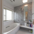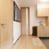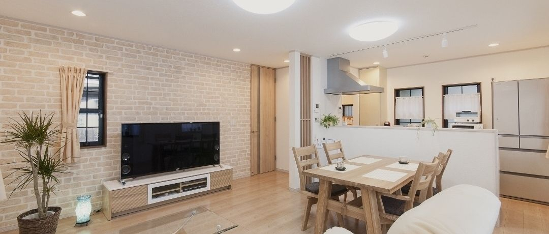 そこで全体の内装を気分も明るくなるような柔らかで明るい色調のものへ変更し、設備も一新しました。キッチンはオープンタイプに変更しキッチンの隣に収納庫兼家事スペースを新設しました。また、リビングはハイドアなどで視覚的な広がりを持たせ、壁一面にはレンガ調のアクセントクロスを貼りました。