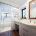 水回り設備は一新。広いキッチンスペースをご要望でしたので、北側にあった壁付けキッチンを取り払い、ゆったりサイズのL字型のシステムキッチンをリビングと対面に配置しました。また、浴室や洗面室も設備をはじめ扉タイルなど細部までこだわり、リゾートホテルのような贅沢な空間が完成しました。