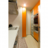 キッチンのデッドスペースにぴったり納まるような食器棚を造作しました。冷蔵庫横のオレンジの家電収納はPanasonicの家電収納棚ですが、左側の棚は色を似寄せで合わせたので、見た目はPanasonicの家電収納と同じ商品と間違えてしまうぐらいの仕上がりになりました。