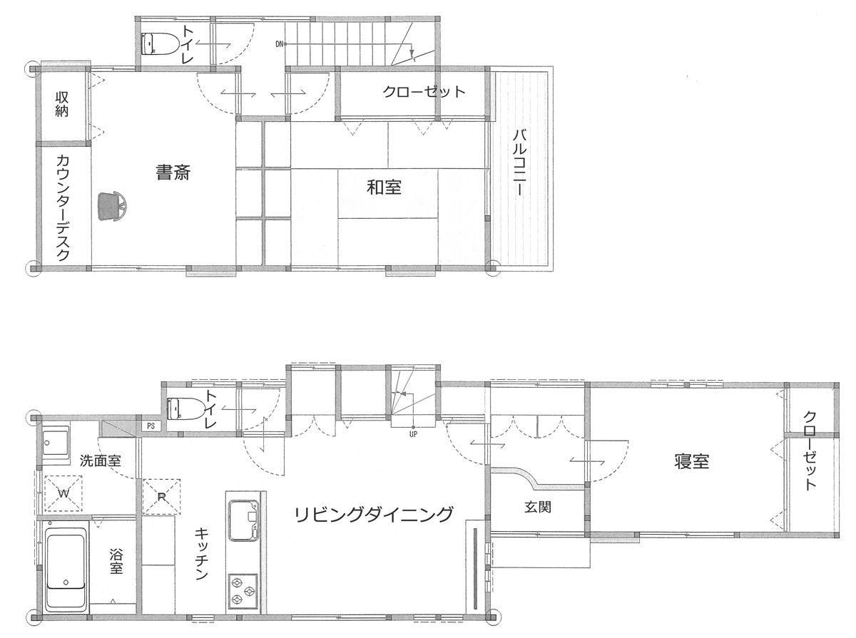部屋数を減らしてゆったりとした造りの3LDKに。キッチン、浴室は位置を大きく移動させるとともに、1階の和室2部屋をつなげてリビングダイニングに変更しました。