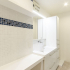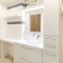 大胆に壁の位置を変え、空間を広げた洗面室。使いやすさとすっきりとした配置を意識し設計しています。収納は洗面化粧台とトールキャビネット、洗濯機上の棚やカウンターなど充実しています。カウンター上部には白いタイルに濃いブルーのモザイクタイルをライン貼りし、清潔感と爽やかさを演出しています。