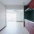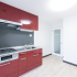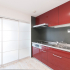 お部屋全体のアクセントになる赤いキッチン。こちらを最初に決めて、それに合わせてグレーのキッチンパネルやリビングの壁紙など色柄を決めていきました。キッチンはスライド収納のシステムキッチンで、収納が多くお手入れもしやすいです。