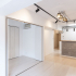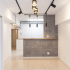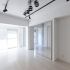 むき出しのコンクリートに塗装を施した天井と、その天井に這わせた黒いダクトレールと照明がカフェのような印象を持つリビングルーム。お部屋自体は少し閉鎖感を感じる縦長の間取りでしたので、間仕切り壁に『ガラスブロック』をはめ込み横の洋室からも光を取りこみ、更にその洋室との間には折れ戸タイプの開閉間仕切壁を設置することで開放感を出す工夫を施しました。