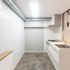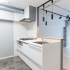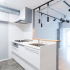 以前は和室が2部屋並んでいた部分を縦長のリビングダイニングキッチンに。キッチンを既存の場所から大きく移動させるためには、排気管や排水管を新しく繋がなければならず、大変な作業です。また、排水のためにはキッチン部分の床を上げる必要があり、排気のためにも天井を…となるはずが天井はコンクリート現し仕上げのため、スパイラルのダクト配管をむき出しにしキッチンから廊下・WICを通って元の外壁スリーブへと通しました。これがかえってインダルトリアルな表情を出しかっこよい仕上がりとなりました。キッチン背面の壁に貼ったサブウェイタイルもよい味となり、カフェのような印象のキッチンとなりました。