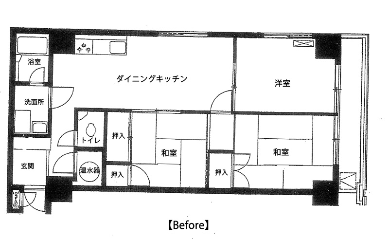 細かく仕切られた3DKの間取りを、玄関から扉レスで続くワンルームにリノベーション。ベッドスペース脇にウォークインクローゼットを新設しました。