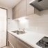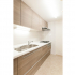 リビングダイニング横に位置する約3畳ほどのキッチン。壁付けのI型キッチンは位置を変えずに設備な内装を交換しました。採用したシステムキッチンはクリナップのラクエラ。ナチュラルな木目の扉をはじめ、床・キッチンパネルのベージュを選びアースカラーでまとめたことで、柔らかで落ち着いた雰囲気のキッチンとなりました。