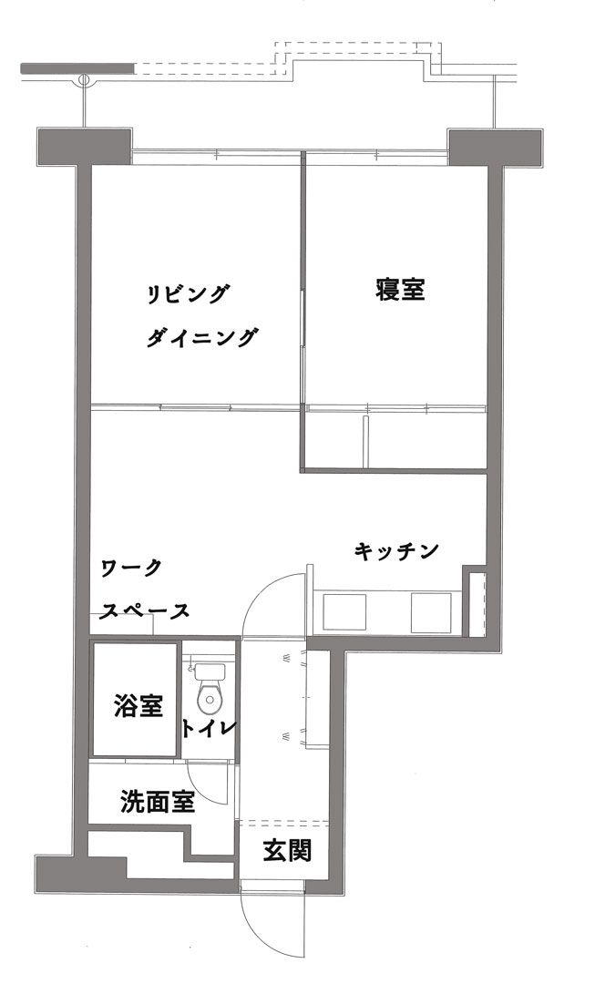 築35年の中古マンションを購入したK様。老朽化した水回りを一新するとともに、在宅ワークのためのワークスペースやリビング・寝室スペースなどを求めてリフォームをされました。リフォームにあたりK様がイメージされたのはカフェ風やヴィンテージ感のある空間。実はK様の趣味がカフェ巡りで、そんな中からイメージが出来上がっていったようです。情報収集をする過程で大好きな札幌のカフェにありそうな扉を見つけ、その扉に合うように内装を決めていきお気に入りのカフェ空間を造り上げていきました。