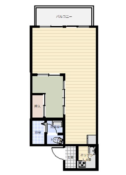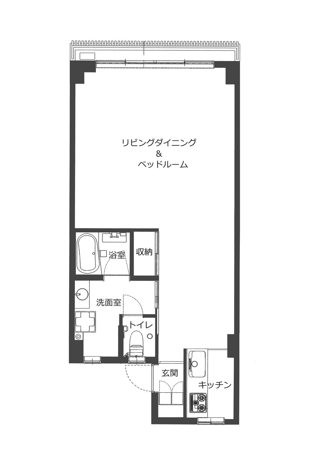 水回りのスペースをしっかりと取り、キッチンも向きを変更。間仕切りは設けずワンルームとし、収納スペースを造りました。