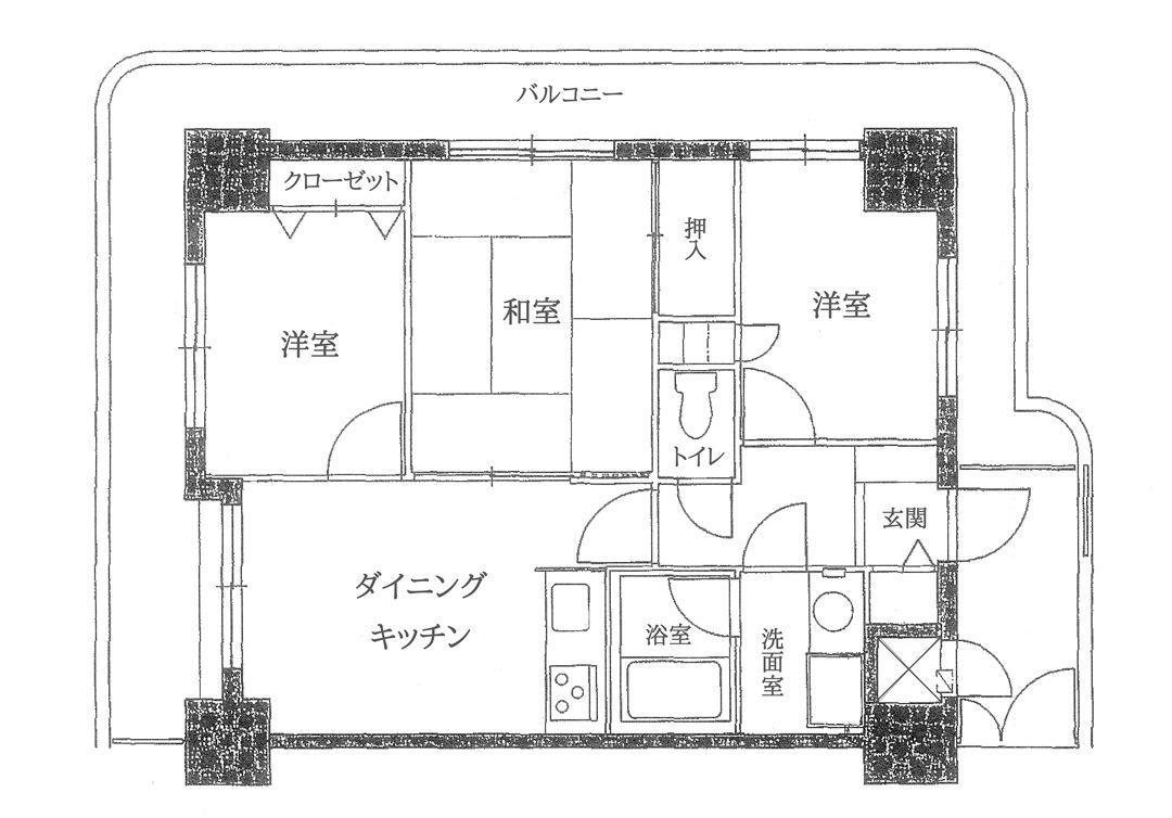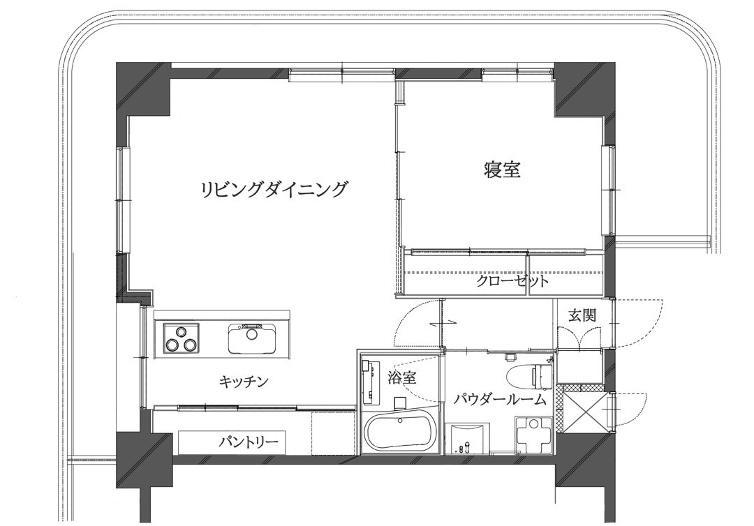 中古で購入された3DKのマンションをフルリフォームしました。細かく仕切られた昔ながらの間取りを取り払い1LDKへ変更、三方位から光がたっぷりと入る広々としたお住まいへと生まれ変わりました。