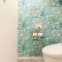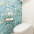 壁のクロスが華やかな印象のレストルーム。壁は汚れ防止の機能性クロスを3面に貼り、1面にアクセントクロスを貼りました。ブルーに水墨画のような花の絵が美しいアクセントクロスは、「花咲くアーモンドの木の枝」というゴッホの絵画をプリントした輸入物のクロス。ゴッホが日本美術に影響を受けて描かれたという作品を壁にあしらうことでレストルームがアート空間となりました。