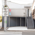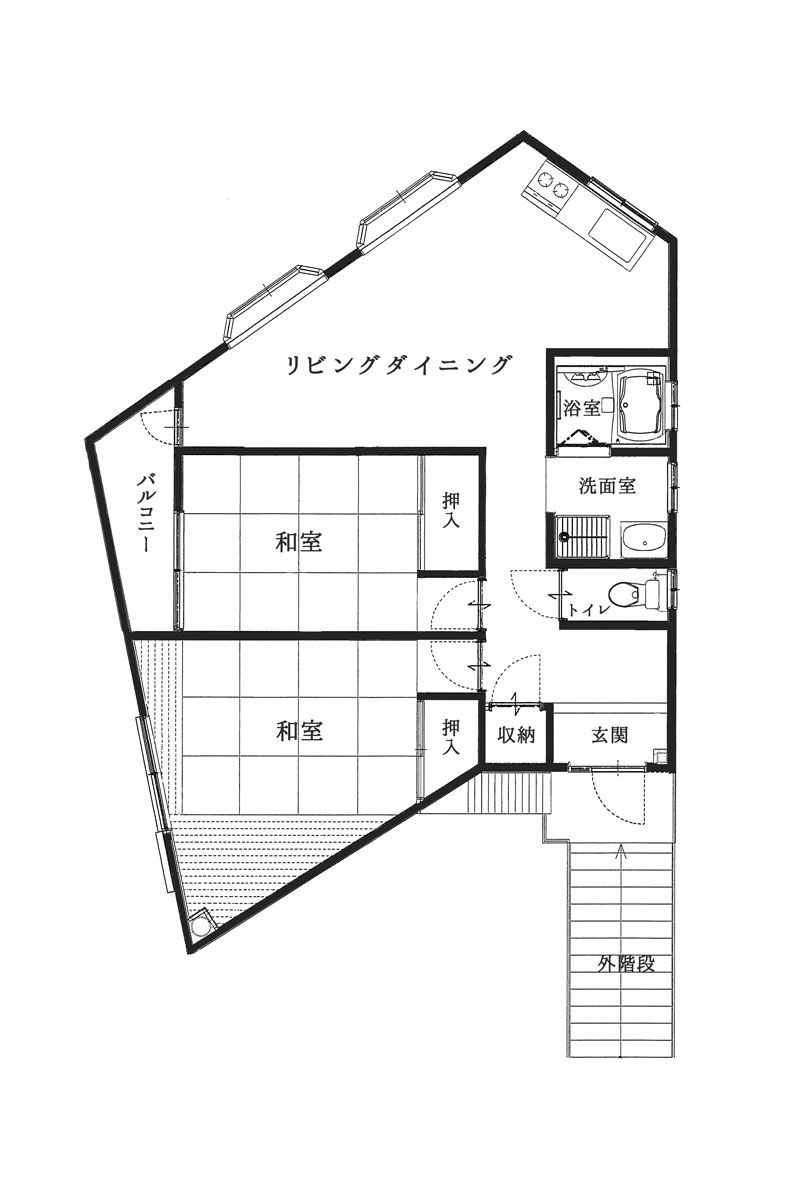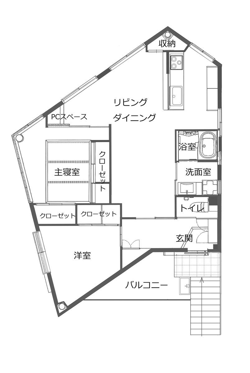 鉄骨造。1Fは駐車スペースで外階段を上り2Fに住居スペースがある構造。5角形のお住まいを間取り変更により、ゆったりとしたリビングを含む2LDKを実現し、多くの収納を備えました。