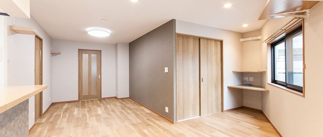 2階部分にある住居スペースは間取りを見直し、水回り位置を移動させることでN様のご希望だった対面キッチンを叶えたほか、これまでよりもゆとりのあるリビングダイニングを実現しました。見た目だけではなく住み心地にも重点を置き、収納面の充実や断熱性の向上、配管の交換を行いお家の問題を解消しました。