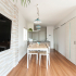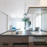 明るく開放的な印象のリビングダイニング。以前のDKは暗く狭い印象でしたが、バルコニーに面した洋室をリビングに取り込みキッチンをオープンにすることにより空間に開放感を持たせました。壁や天井のクロスはホワイトをベースとして清潔感を出しつつ、一面には古材テイストのウッディなアクセントクロスや白ペンキの板壁柄クロスを採用し西海岸のビーチを思わせるラフな雰囲気に仕上げました。ヤシの木を飾って天井のシーリングファンを回せば、そこはカリフォルニアの風を感じる空間に。