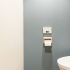 グレーのアクセントクロスやベージュでコーディネートした梁や床が落ち着いた空間を演出するトイレ。床は洗面室を素材を揃えてラグジュアリー感のあるタイル調のクッションフロアを張りました。設備は故障した時のことを考えて便器、タンク、ウォシュレットそれぞれ独立している組み合わせ式を選んでいます。