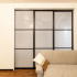 間仕切り戸はスケジュールの都合上、格子部分がシルバーのものしか入れられなかったのですが、お住まいのデザインを考えると黒色の格子が適していると考え、黒いシートを貼ることでイメージ通りに仕上げました。