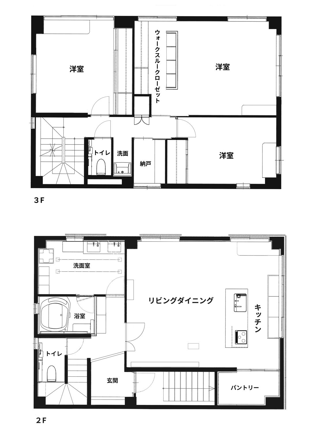 5SLDKだった間取りを3LDKに変更しました。2階は洗面室、浴室を広く取り、LDKも廊下だった部分を取り込みゆったりとした造りに。