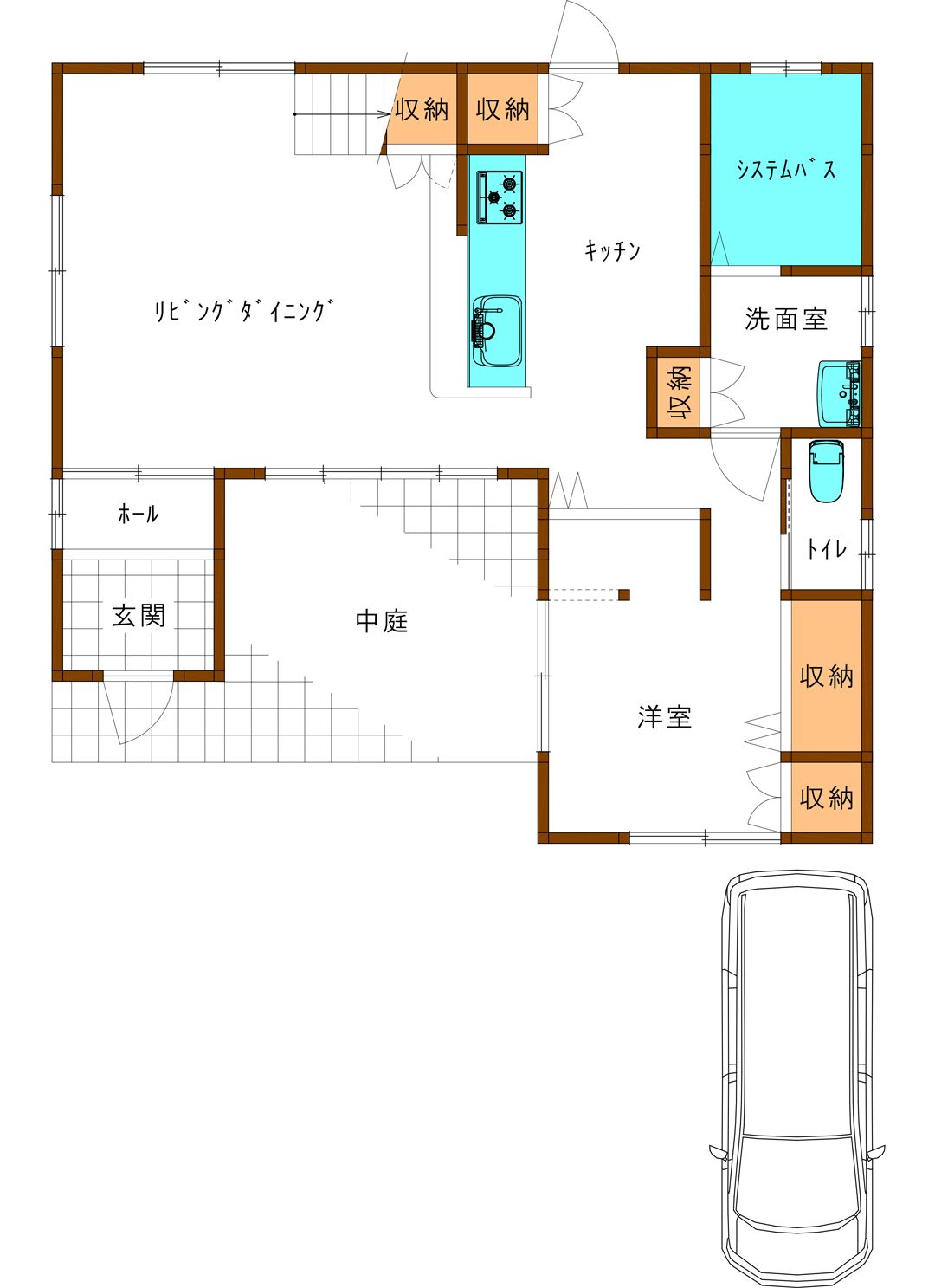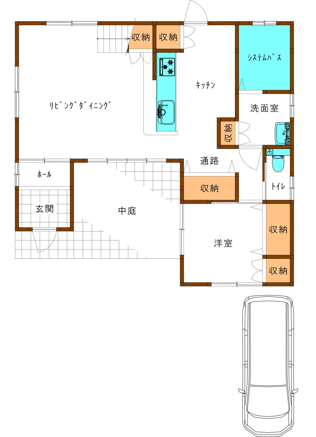 1階は中庭を囲むようにコの字型に配置された、少し変わった物件。中庭を含めると1階だけで70㎡~と広めです。