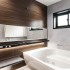 グレーやダークブラウンなどシックな色味でまとめた空間には調光付きの照明を備え、高級スパのくつろぎを感じさせるバスルームとなりました。