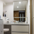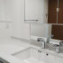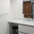 そこで、洗面台の位置を変更し、洗面室の奥のスペースに洗面台を設置。壁から壁までたっぷりサイズの洗面台は横にカウンターが付いており、ゆっくり椅子に座って髪を乾かしたりお化粧をすることができるようになりました。奥に鏡があることやホワイト系の天板や扉板の製品を採用することで、空間の広さ自体は変わっていないものの、これまで感じていた狭さが解消され視覚的に広がりを感じる洗面室となりました。