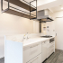 キッチンを壁付けから、リビングを見渡せる開放感のあるアイランドキッチンに変更しました。キッチン上部の収納をオープンシェルフにすることで抜け感を出しています。