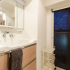 洗面化粧台はお手入れのしやすく大きな洗面ボウルや通気性がありカビが発生しにくい仕組みの鏡裏収納が特徴のエポック(トクラス)を選びました。収納扉は浴室と合わせてライトベージュの木目柄に。傷みが激しかったという床にはベージュのストーン柄フロアタイルを張り柔らかな雰囲気に仕上げています。また、洗面化粧台横の収納部分は扉を塗装し直してリフレッシュしました。