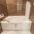 「LIXIL」リノビオVの1216サイズを設置。換気乾燥暖房機と追い炊き機能付き、シャワーバーもありお好みの高さに調節可能で機能面も充実しています。高級感を感じさせるウォールナット柄の壁パネルがポイントです。