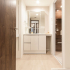 洗面化粧台はPanasonicのシーラインを設置しました。幅90cmの三面鏡、カウンター幅は約1m10cmあり、広々と使うことができます。洗面化粧台の背面にはグレイッシュカラーの織物調クロスをアクセント貼りしました。また、洗面台の左手の壁には可動棚を設置し、収納力も確保しています。リフォーム前と比べすっきりと明るい空間に仕上がりました。