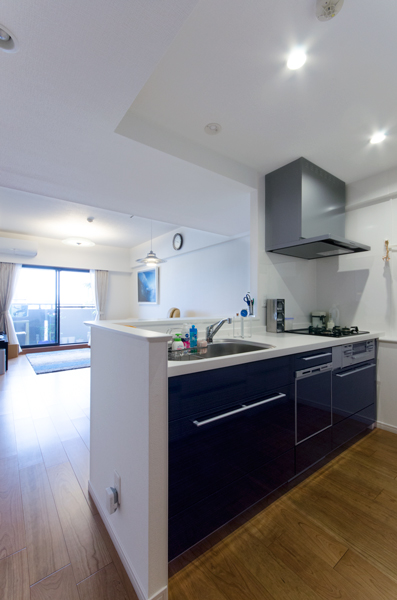 システムキッチンのカラーも「ラピスブルー」という紺色。リビングの海の絵と相まって深海を連想する印象的なキッチンです。