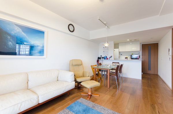 木目が似合うナチュラルテイストのLDKは絵画やラグに使われたブルーの色がお部屋の良いアクセントとなっています。