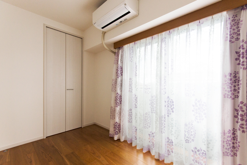 寝室で柔らかく揺れるカーテンはお嬢さまのセレクト。ほんのりピンクのお花が咲いたレースのカーテンをお嬢さまはとても気に入られていました。そこで担当者はレースカーテンを部屋の内側にし、ドレープカーテンを窓側にする、通常とは逆のスタイルを提案。