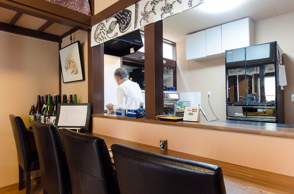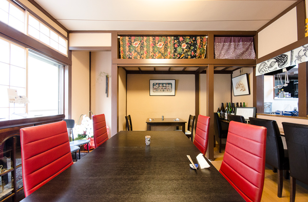 お客様を迎えるフロアは、「当初はお座敷も考えた」といいますが、畳の費用が高いことから断念し、元の柱や塗り壁が味わい深かったのでそれらを活かしながらカウンターやスイングドアなど店舗に必要な設備を新設して仕上げました。