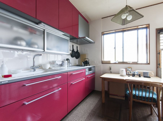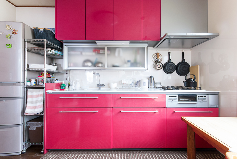 ご選択されたのは空間が華やぐラズベリーカラーのキッチン。ちょうど製品リニューアルのキャンペーンで検討していたよりも上のランクのキッチンをお得に入れることができたのだそう。