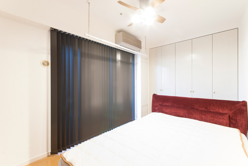 主寝室となるお部屋の掃き出し窓には縦型のブラインドを取りつけました。バーチカルブラインドと呼ばれるこのブラインドはスタイリッシュでお洒落な印象。スリットから入る光もライン状で洗練された印象となり、また縦ラインが強調されるので、お部屋の天井が高く見えるという効果もあります。色は壁のアクセントクロスと色味を合わせ、グレー系を選んだことで、統一感のあるシックな空間となりました。