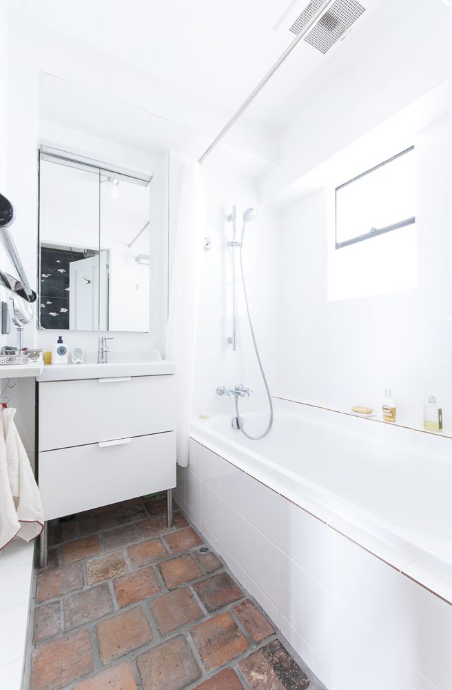 I様が一番頭を悩ませたと話すのがバスルーム。I様のお宅のバスルームは海外でおなじみの、バスタブと洗面がまとまっている空間です。真っ白なタイル張りの無垢さと床のレンガの渋さが共存しており、新しいのにまるで昔から使われてきたお部屋のようなノスタルジックな趣があります。