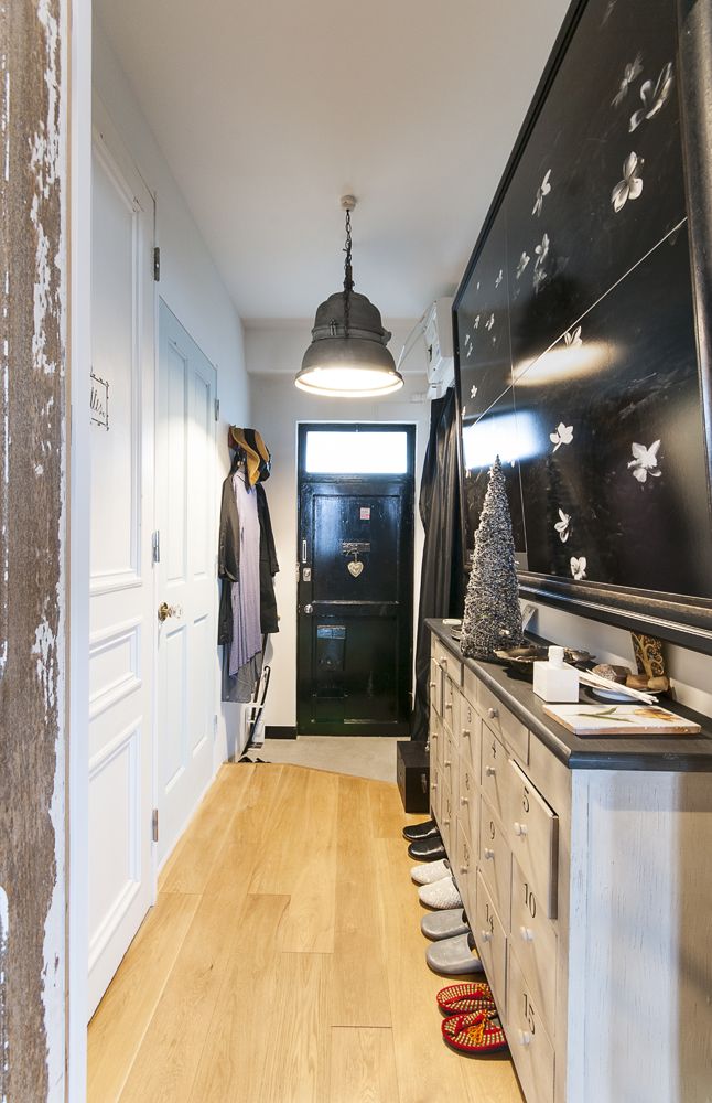 玄関に入ってすぐに天井から釣り下がる大きな釣鐘型のライトには誰もが目を剝くはず。廊下にはこれまた大きな、美しいが憂いを帯びて水面にたゆたう花の写真パネルが抜群の存在感を放っています。その廊下を抜けた先の、日本の住宅ではあまりお目にかかることのない、意匠性のある美しいドアを開けると、広がるのはパリのアパルトマンそのものの空間でした。