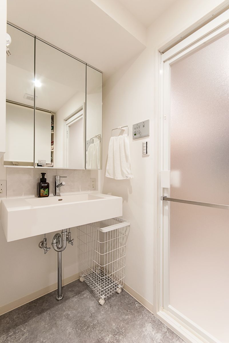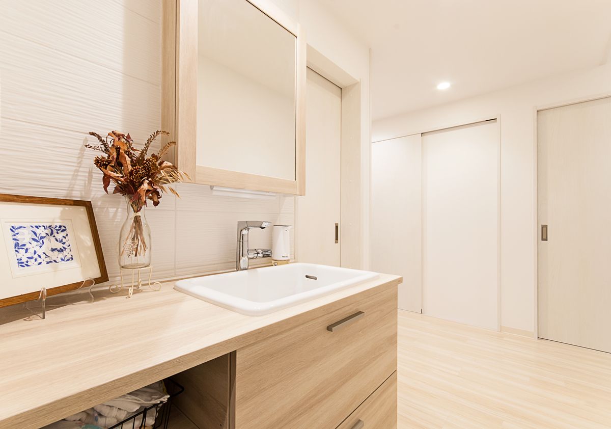 来客も使用する廊下の洗面台はまるで家具のような意匠性の高い洗面台を選んだ一方、ご家族だけが使う脱衣室は引き出しなどがないシンプルな洗面ボウルを設置し、下に洗濯カゴを置けるようにするなど、それぞれ場所に応じて異なるデザインの製品を選んだことで二か所の洗面スペースは全く異なる趣となりました。