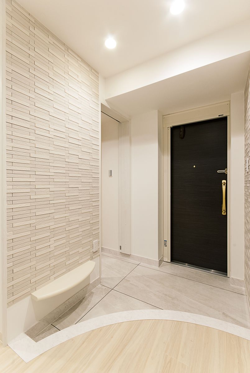 K様邸のなかでもホテルのような洗練性を特に感じるのが玄関です。大理石の床やアール状に湾曲する框、立体感のあるタイル壁の空間は玄関というよりもエントランスといった方がしっくりとくる雰囲気。