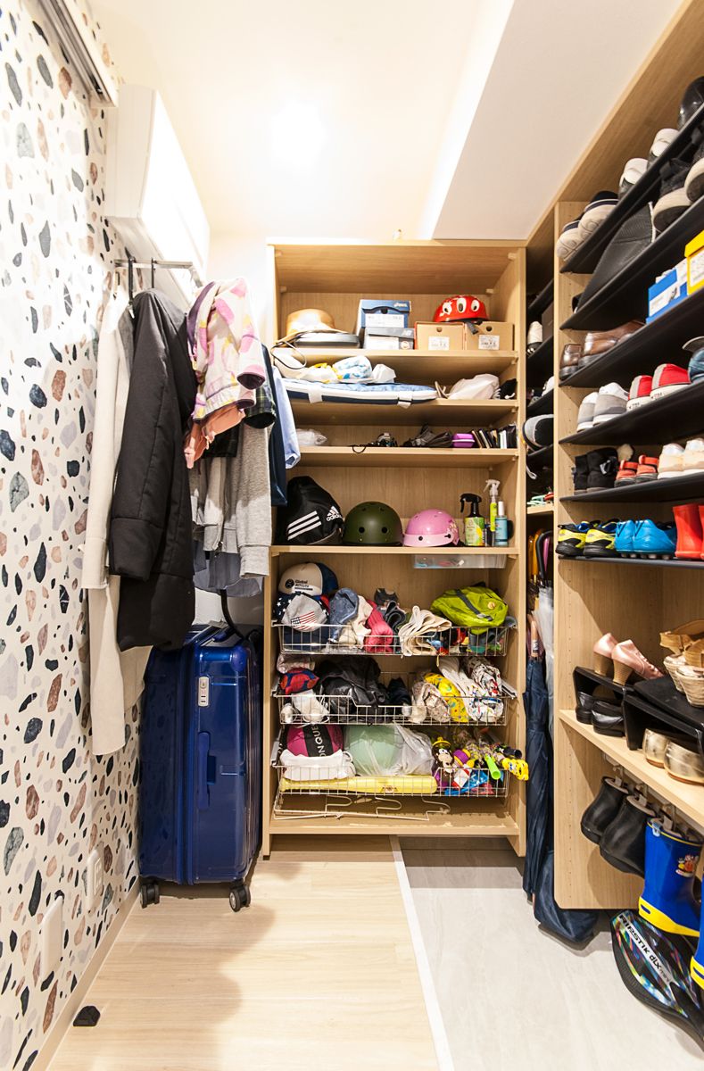 そしてK様が収納のなかでも特にこだわったと話す収納が玄関横に設けた2.4帖ほどのウォークスルークローク。ハンガーパイプやバスケット付きの収納棚は靴だけでなく雨具やお子さまの外遊びの道具、帽子やマスクなどお出かけに必要なアイテムがたっぷりとしまえるほか、壁には上着掛けを設置。「冬場にコートを掛けられるのはすごくいいなと思います」