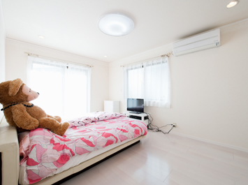 床と壁をホワイト基調にしたことで、視覚的に空間の広がりが生まれたのです。それは、2階の部屋も同じ。シンプルな白がベースになった部屋は、陽差しをいっぱいに受けて天井が高く感じます。