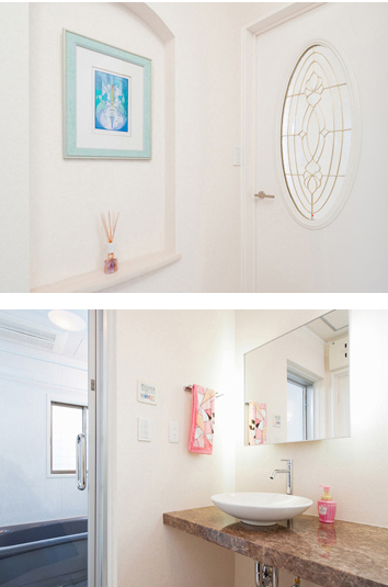 「このガラス扉は譲れないもので、オーダーです」。もう1つがトイレと洗面室の水回り。「洗面台はユニットタイプのものは機能的ですが、個性がありませんよね。