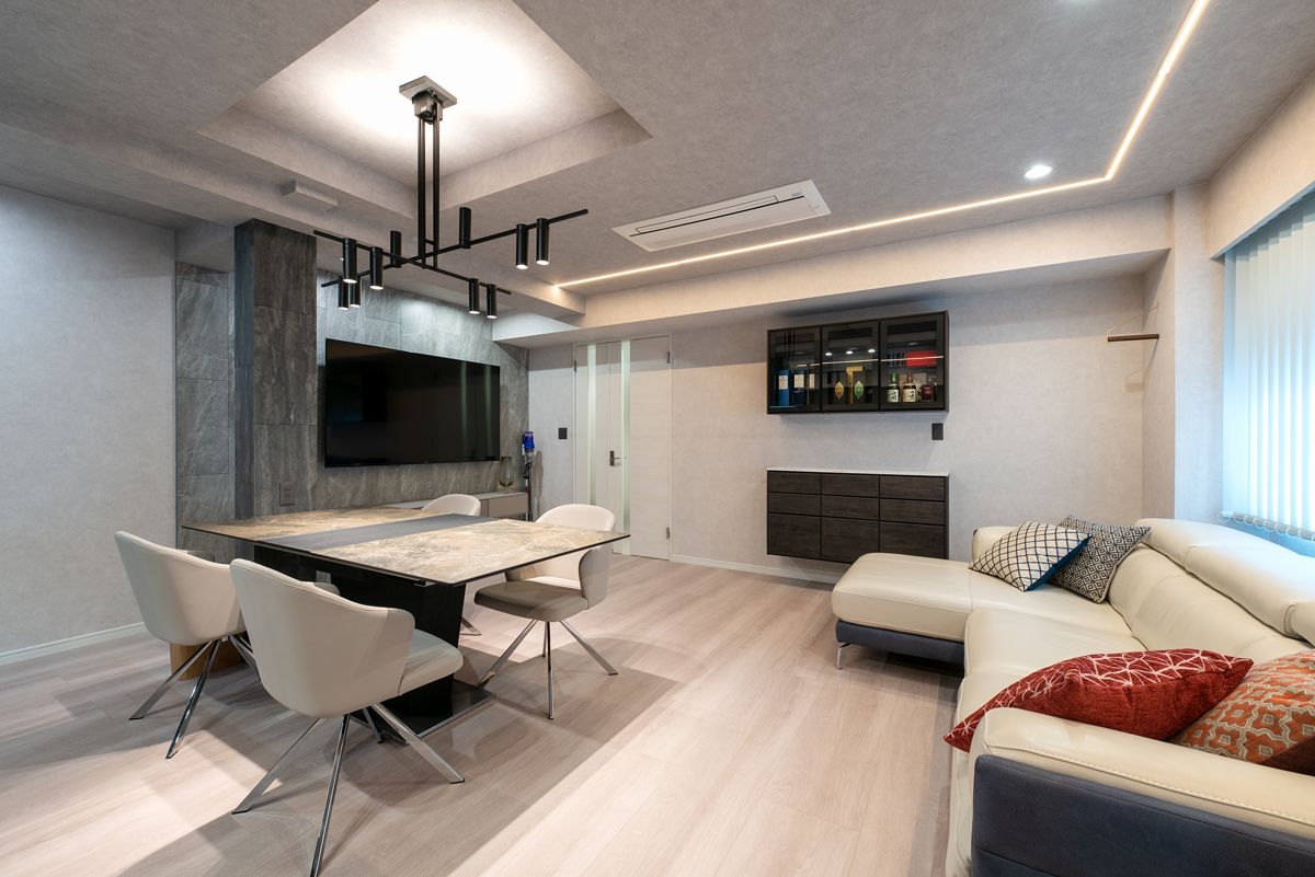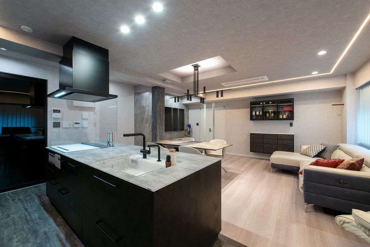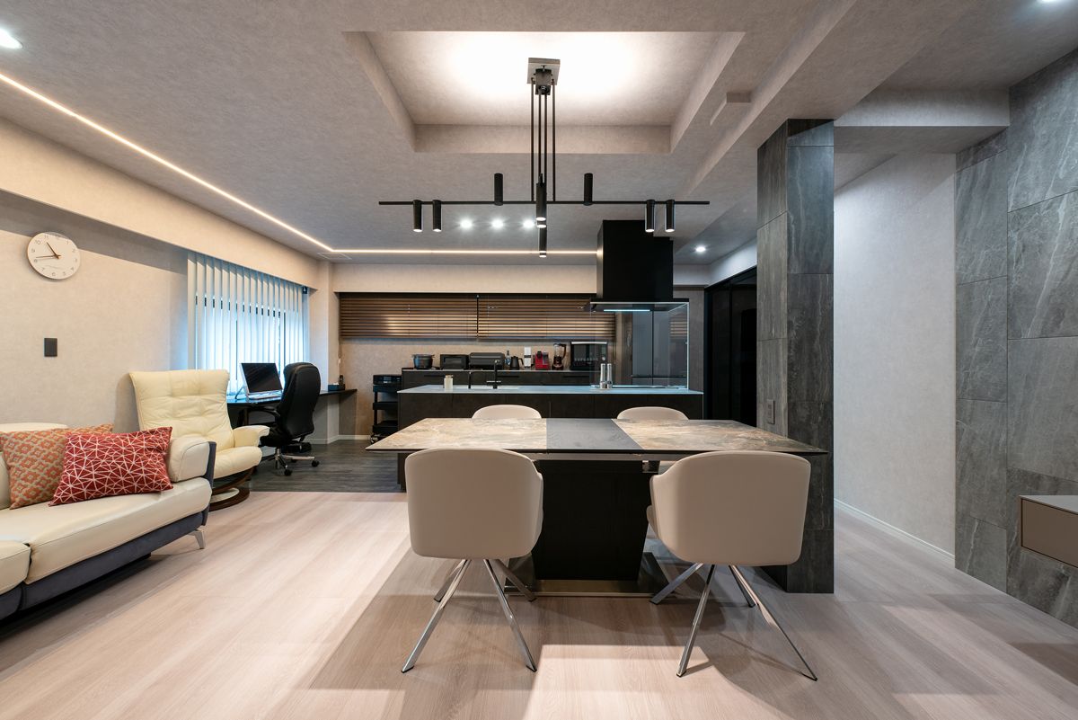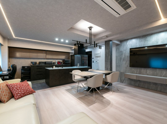 室内に関しては、プランニング後に鉄柱や梁の欠損が見つかりキッチンのレイアウト変更が生じましたが、結果的にLDKの使い方としては良い方向になったと思います。内装は高級感を意識し、イタリアンタイルを多用し、高級仕様の住宅設備機器を設置するなどして高級ホテルを思わせるような仕上がりに。