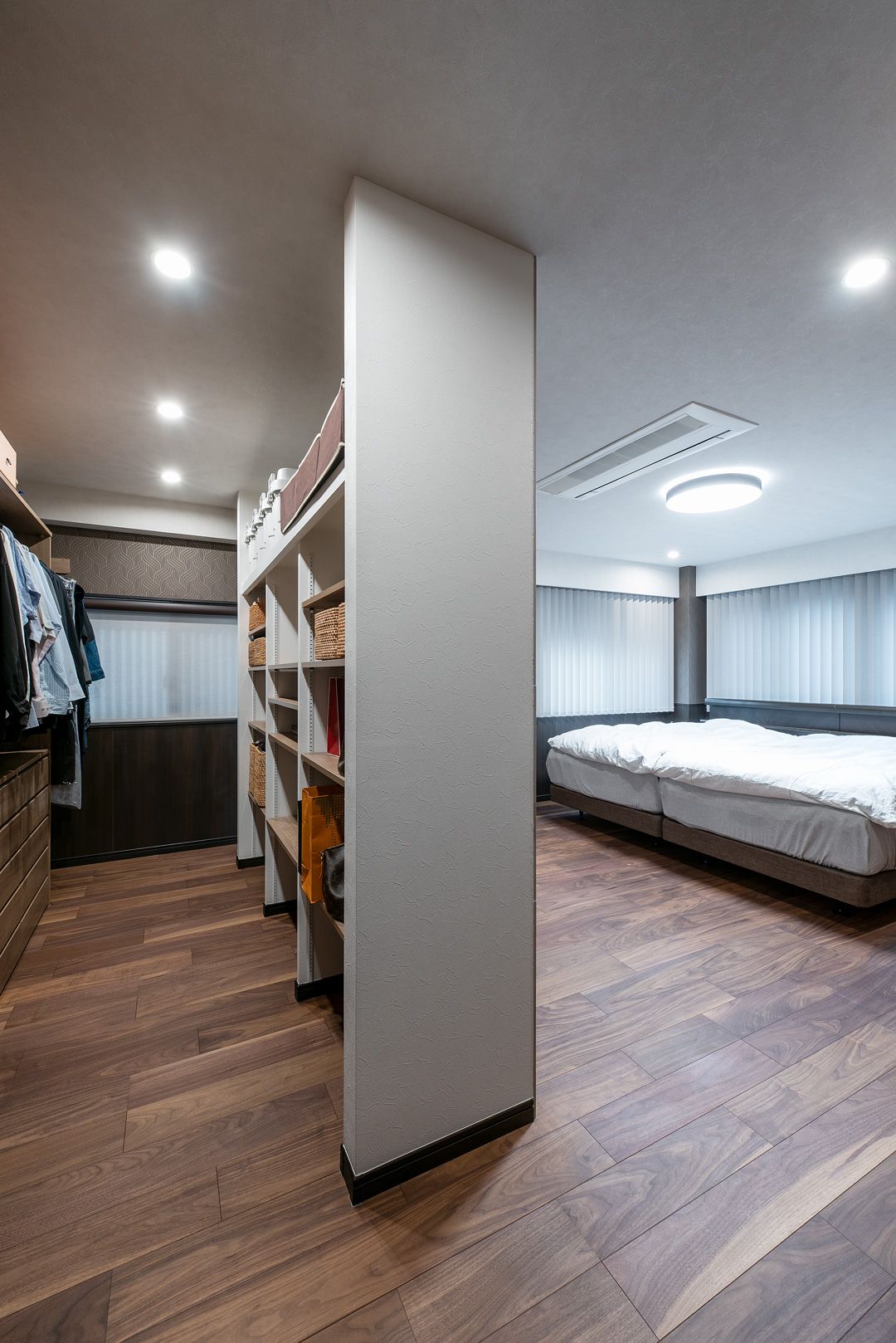 各居室スペースもご家族のご要望に沿って、仕上げ材を提案し施工。夫婦寝室はオープンクローゼットを設け、壁には大判のイタリアタイルを施工したり、木目調腰パネルを貼るなどし、高級スイートルームを構築しました。