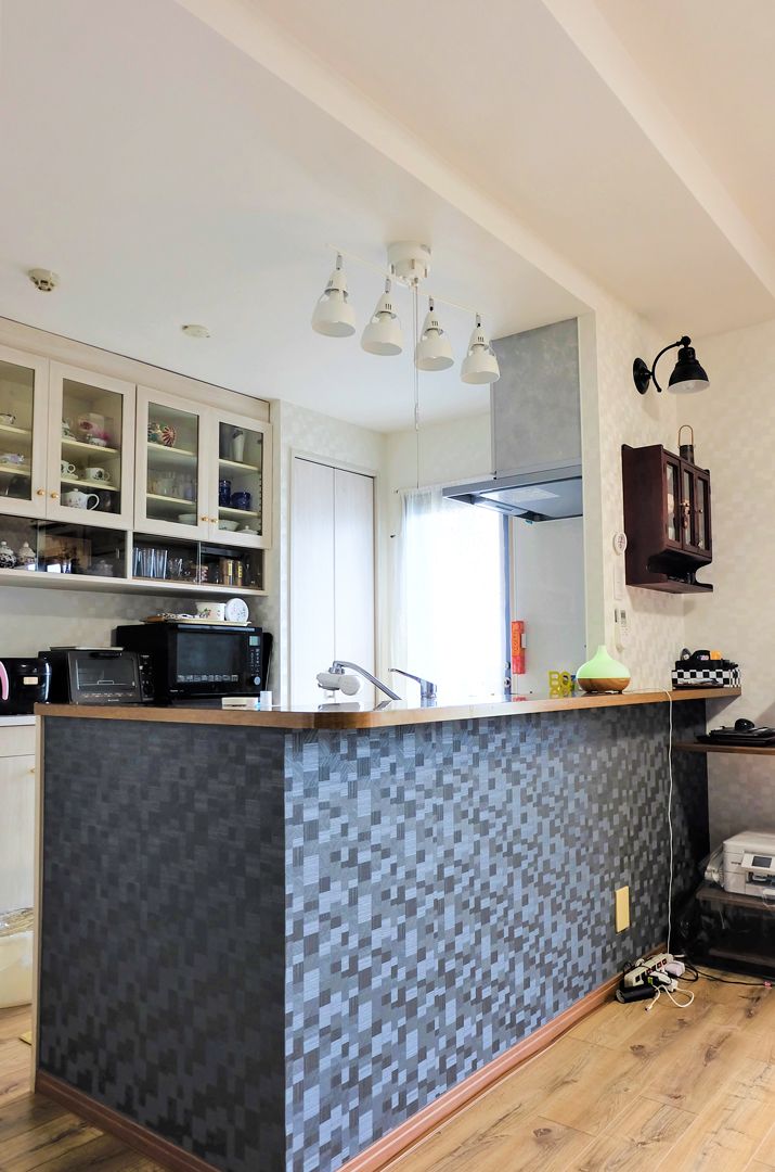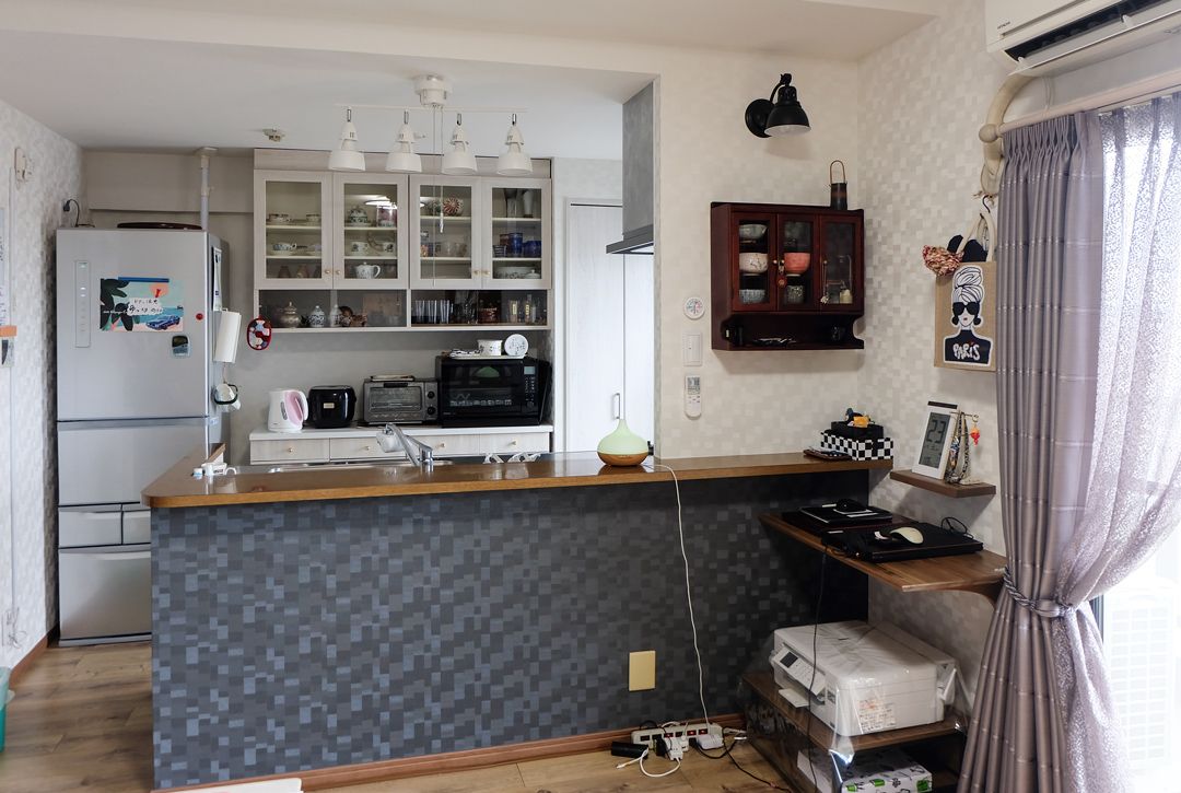 D様お気に入りのこのクロスは、キッチンカウンターにも色違いのブラックを使用しており、リビングに入ってくると一際目を引く存在感を放っています。「引越し業者の方がキッチンカウンターのクロスを見て『お洒落!』と言ってくれた時、やった‼と思った」、「(心の中で)ガッツポーズした‼」という可愛いエピソードも聞くことが出来ました。