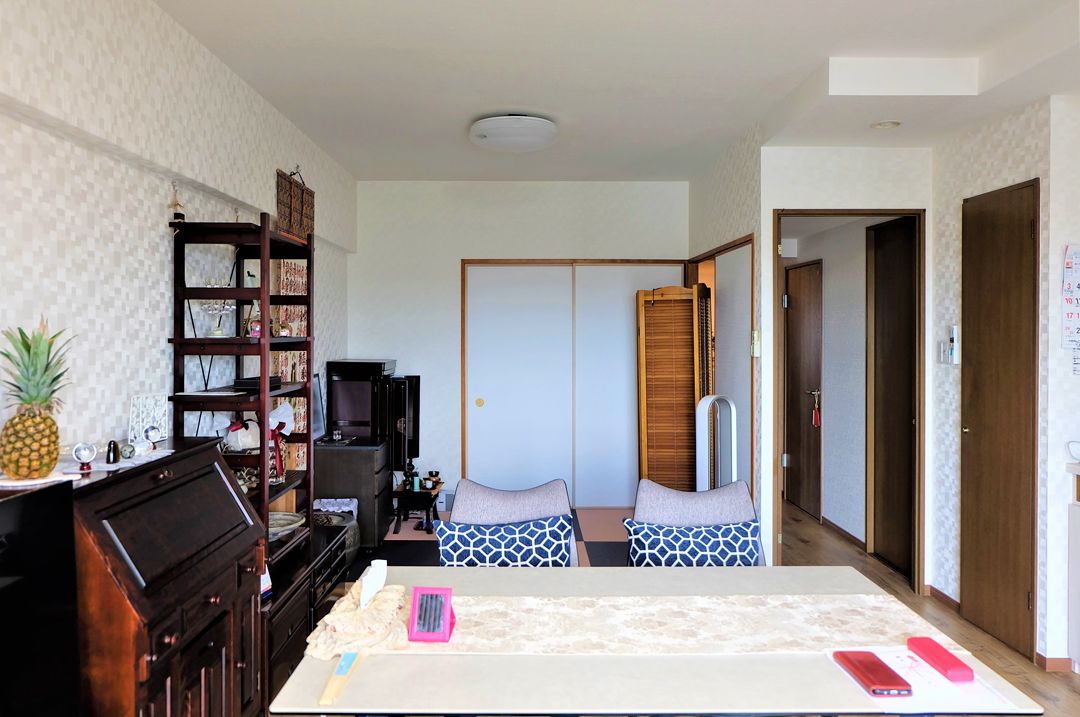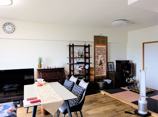 限られたスペースの中で「とにかく空間を広く見せたい」というのが、今回のリフォームにおいてD様の一番のご要望でした。リビング隣の6畳の和室を3畳へと間取り変更し、リビングスペースを拡張。さらに和室とリビングを隔てていた壁を撤去することにより、開放感ある和室続きのリビングスペースが完成しました。