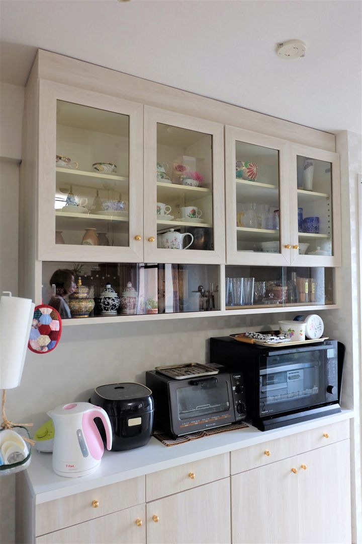 リビングからキッチンが見通せるようになり、周りの方から好評だと教えてくださったのは、存在感のあるカップボードです。こちらは以前から使用していたものですが、全面に白い木目調の化粧シートを貼ることにより、見違えるほど新しく生まれ変わりました。「あえてそのまま残した」というゴールドの取手が、素敵なアクセントになっています。